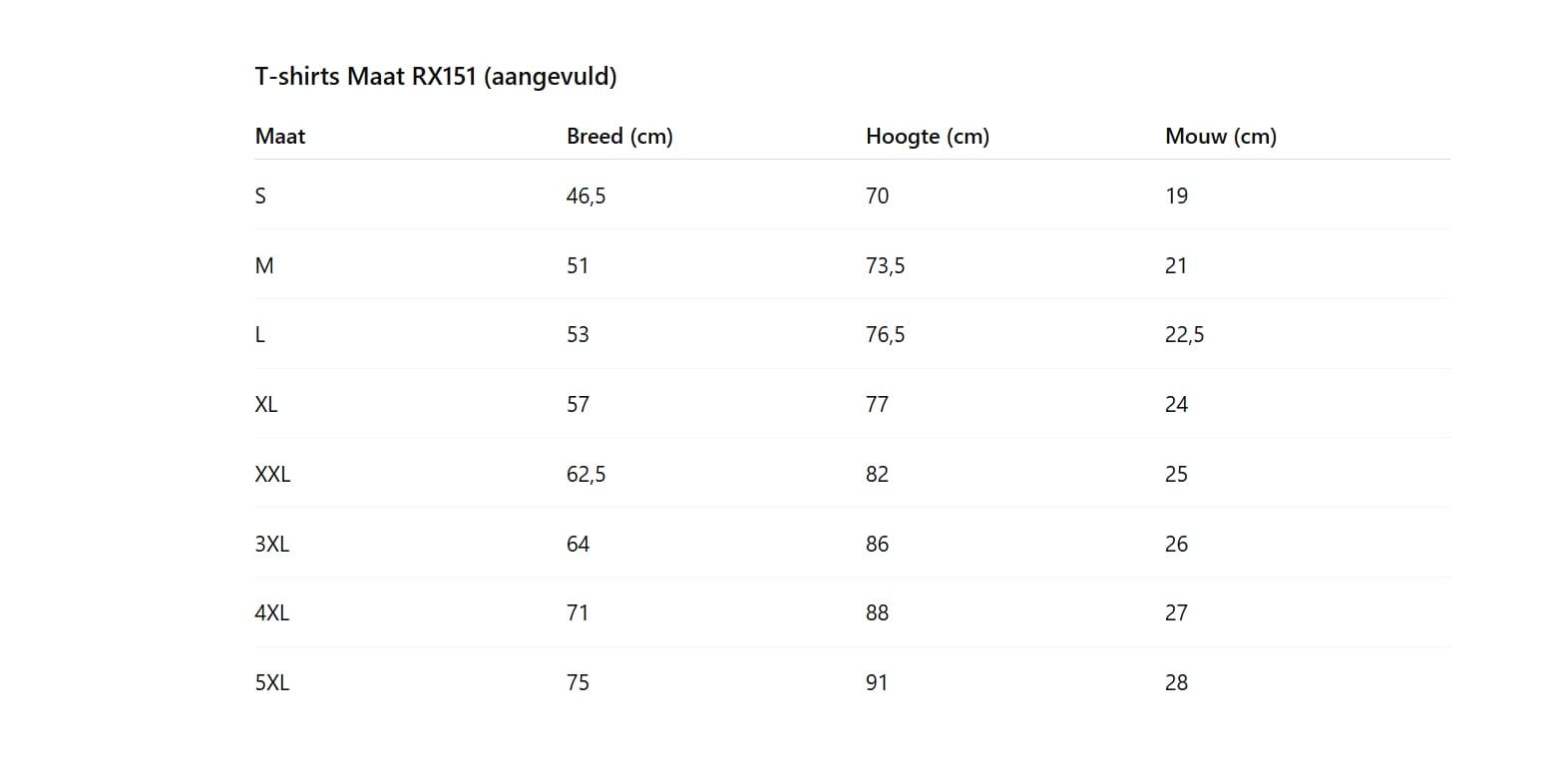 Bekijk de maattabel en wasvoorschriften hieronder en kies de juiste maat. Let er wel op. Vanaf 5XL komt er €1,50 bij vanuit de fabriek.