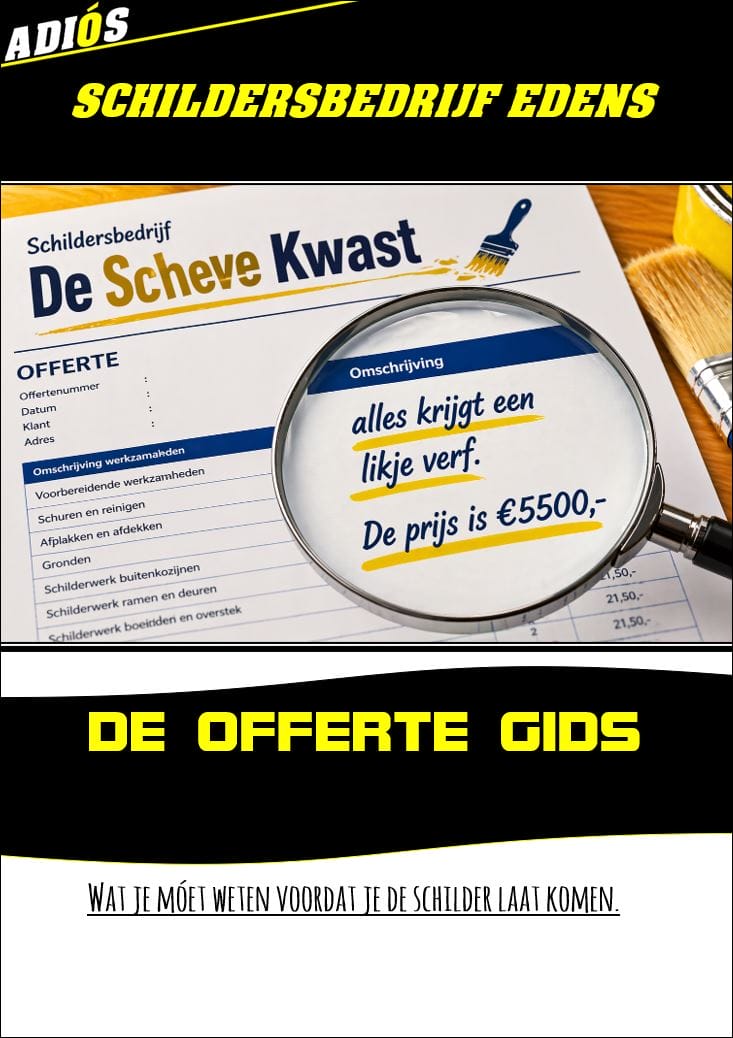 In mijn nieuwe e-book, "DE OFFERTE GIDS", neem ik je bij de hand. Ik deel zaken die voor mij als professional vanzelfsprekend zijn, maar waar een malafide bedrijf je nooit op zal wijzen. Ik leer je de rode vlaggen herkennen voordat je een handtekening zet.